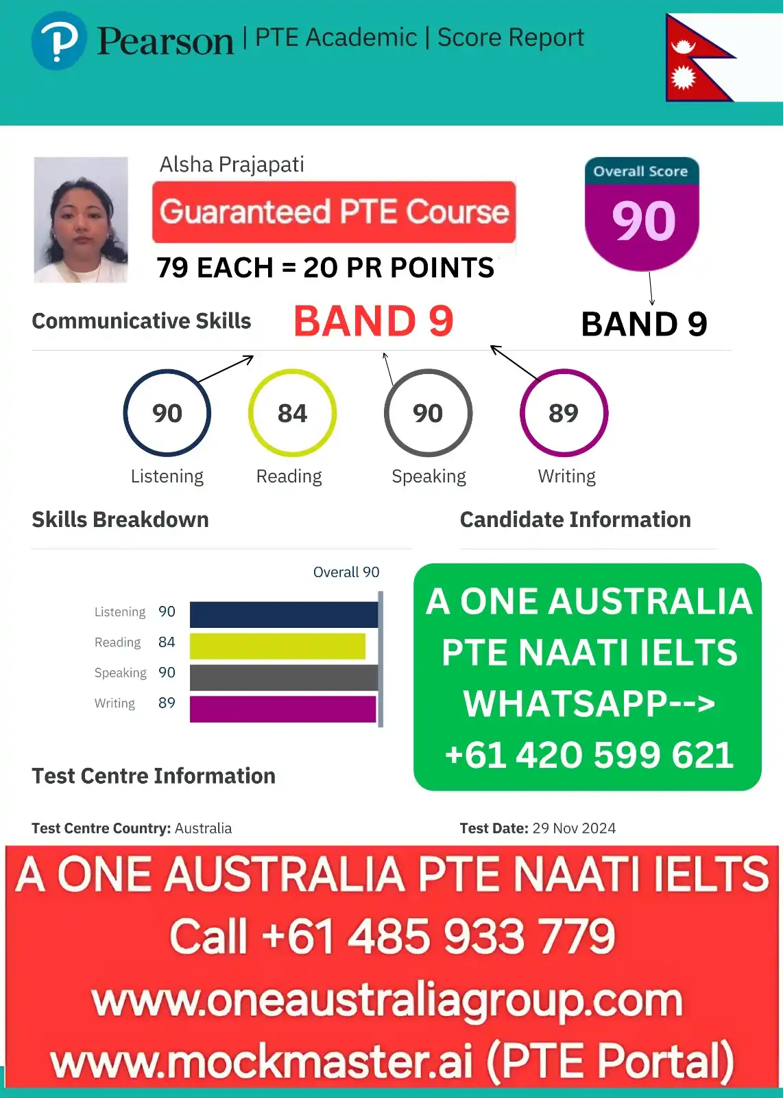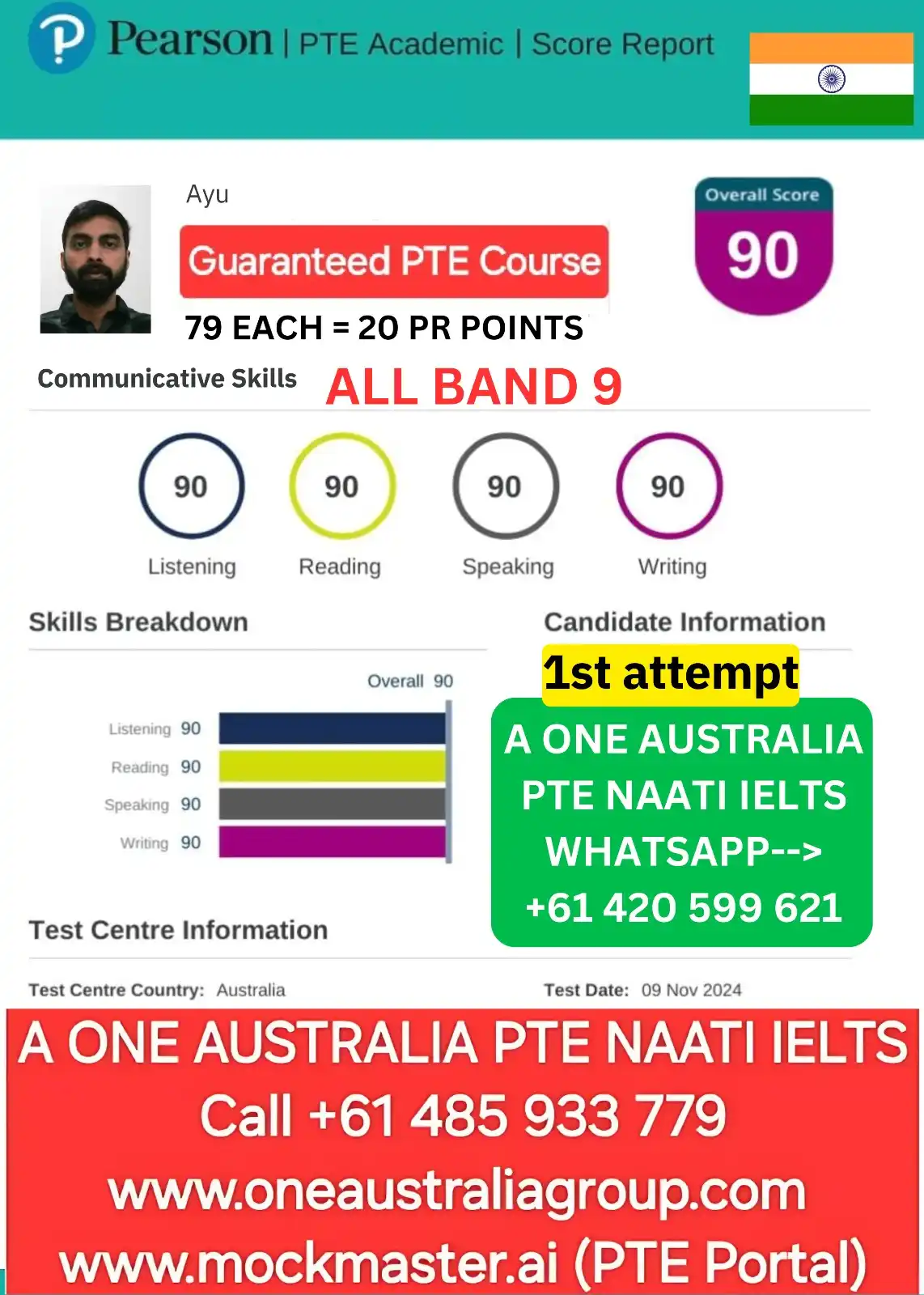 For preparation, you can practice anytime from home with Mockmaster.ai, which provides AI-scored mock tests and real exam question banks. And if you’re looking for structured coaching, A One Australia Education Group offers online PTE courses guided by expert tutors to help you score high, whether you choose test center or home-based PTE.