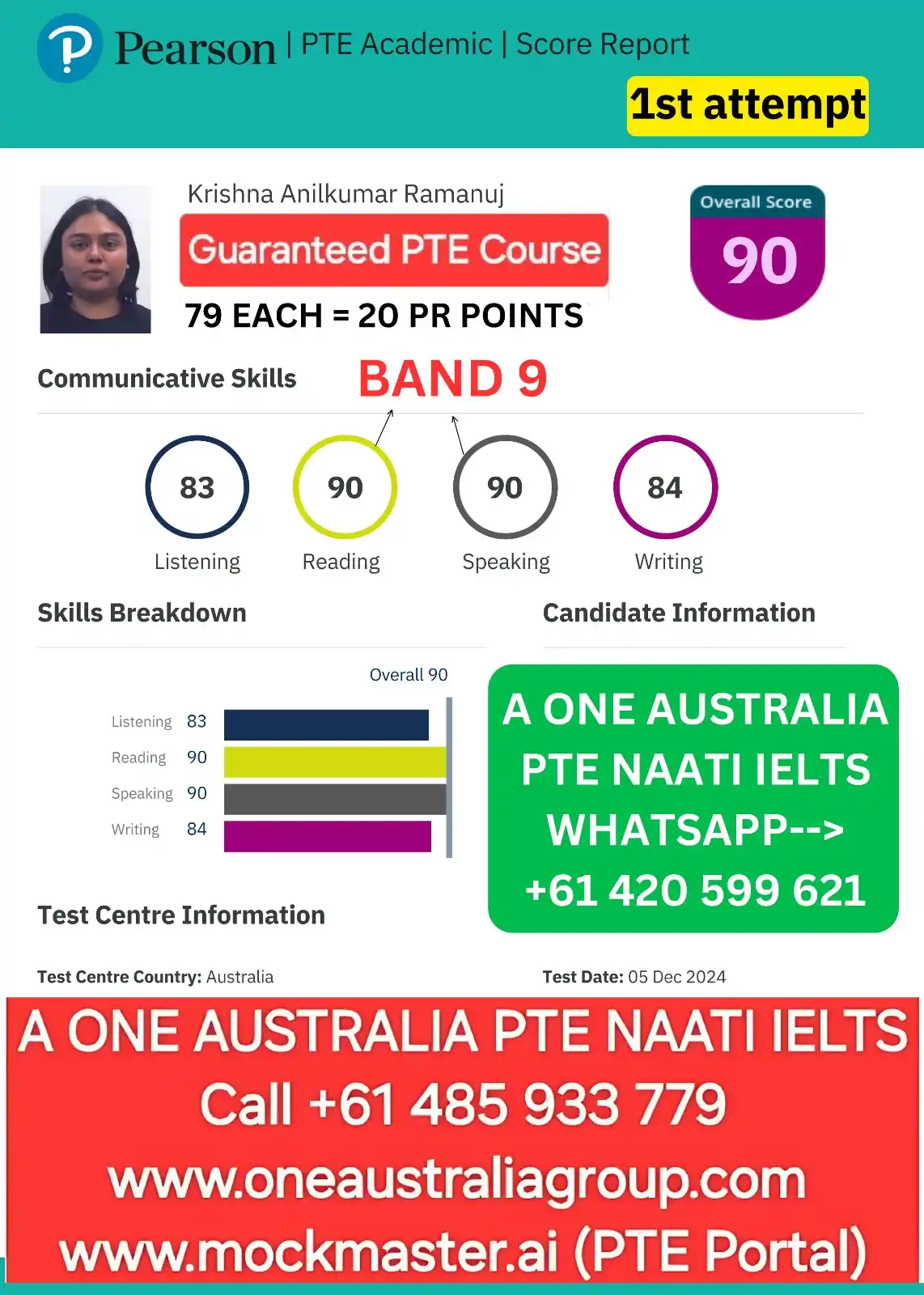 - Learn from one of the very few PTE Classes in Australia to have a BAND 8.0 score in Writing and scores of 9/9/8/8 (Overall 8.5)